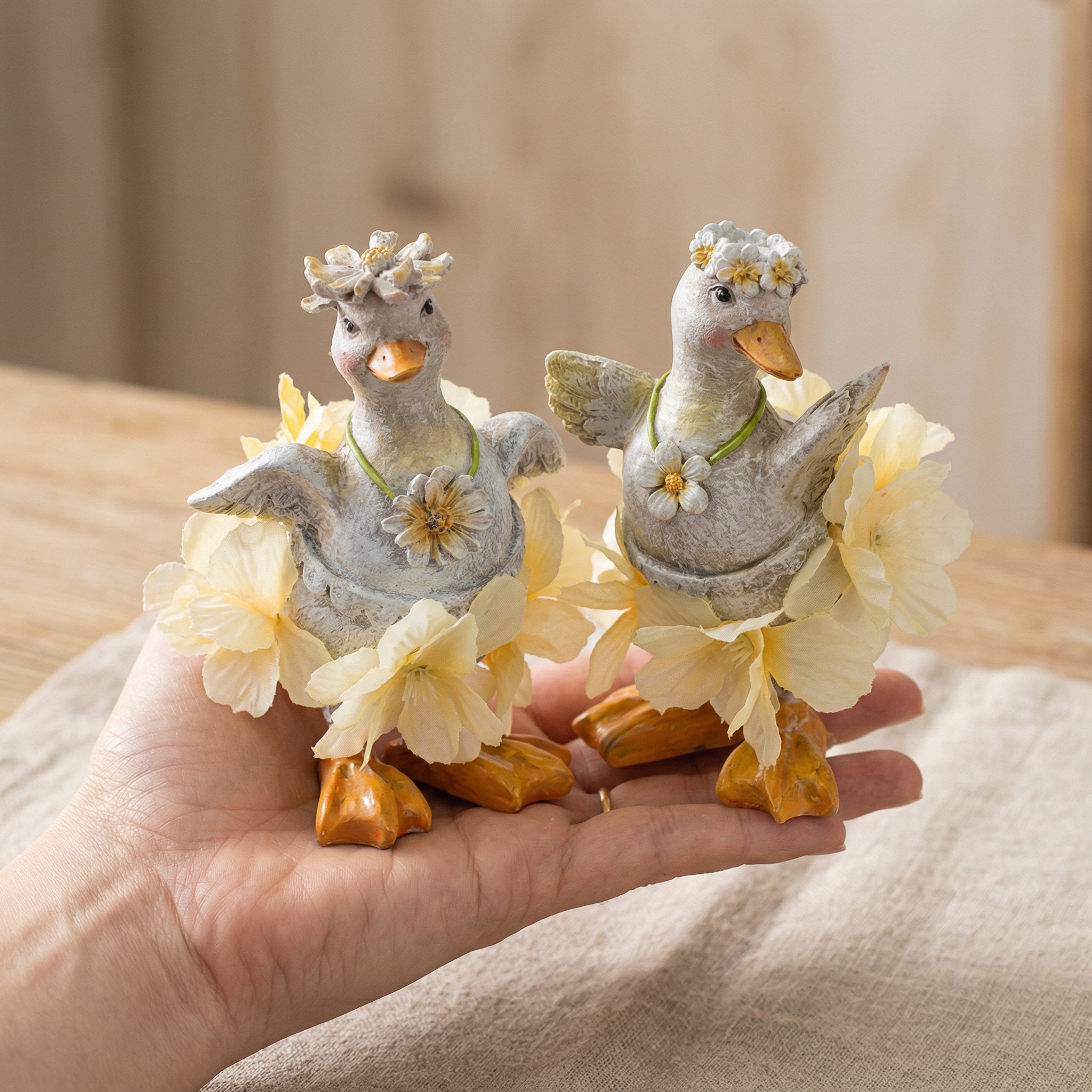 Inserite in un ambiente scandinavo o moderno, queste delicate anatre si sposano perfettamente con materiali leggeri e naturali come il legno e il lino. Sono perfette come decorazioni primaverili o pasquali per creare un'atmosfera allegra.