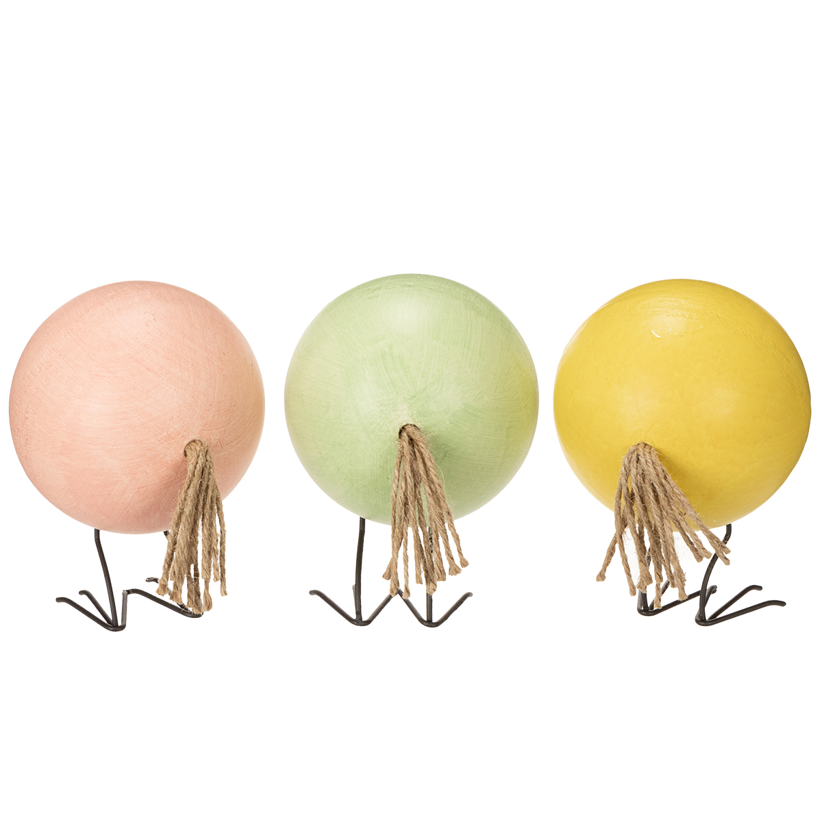 Questi pulcini decorativi colpiscono per la loro lavorazione di alta qualità e la loro versatilità. La combinazione di materiali naturali come legno e metallo si integra perfettamente in una varietà di stili di interior design. Il corpo rotondo in legno ha un aspetto armonioso e naturale, mentre il becco e le zampe in metallo creano un elegante contrasto. I sobri colori pastello giallo, rosa e verde rendono questi pulcini un classico intramontabile, facilmente abbinabile ad altre decorazioni primaverili e pasquali.