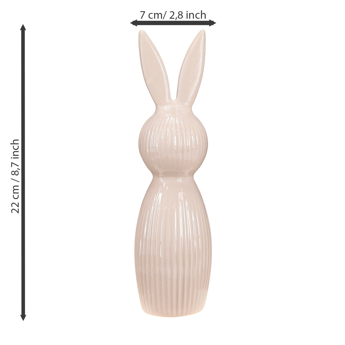 Un oggetto decorativo che unisce stile e fascino: questo coniglio in ceramica è alto 22 cm e affascina con la sua silhouette slanciata e la delicata tonalità rosa. Le sottili scanalature verticali gli conferiscono una texture elegante e aggiungono un tocco giocoso e dinamico al design. Con un diametro di 7 cm, è salvaspazio e si adatta perfettamente anche a davanzali stretti o mensole. Il materiale ceramico di alta qualità colpisce per la sua solidità e durevolezza, ideale per apparire sempre al meglio, anche in aree molto frequentate come il soggiorno o la sala da pranzo.