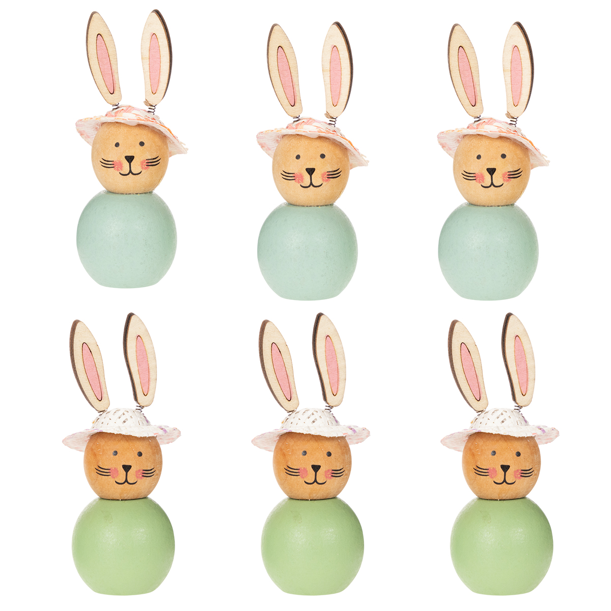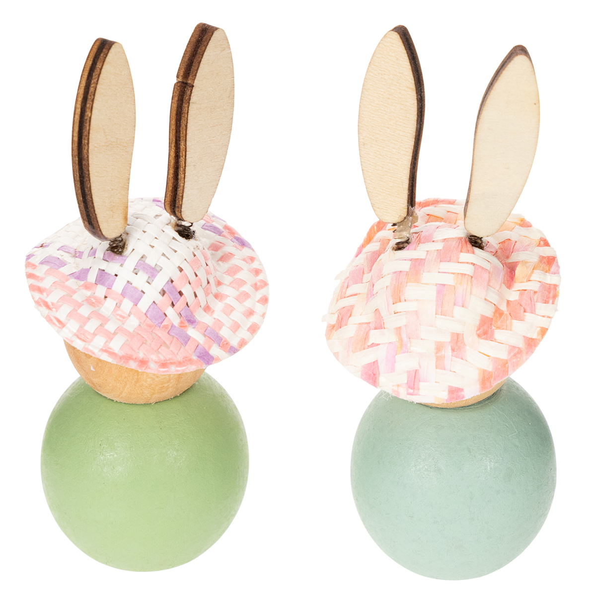 Queste statuette in legno colpiscono per il loro fascino naturale e il loro aspetto allegro: il legno chiaro abbinato a delicate tonalità di verde e menta incontra un design giocoso. I cappelli rosa, in particolare, conferiscono alle statuette un elegante tocco vintage. Ogni coniglio è alto circa 9 cm e porta un tocco di primavera nella vostra casa. Le orecchie su molle metalliche non sono solo di grande impatto visivo, ma aggiungono anche un dettaglio vivace che catturerà sicuramente l'attenzione.