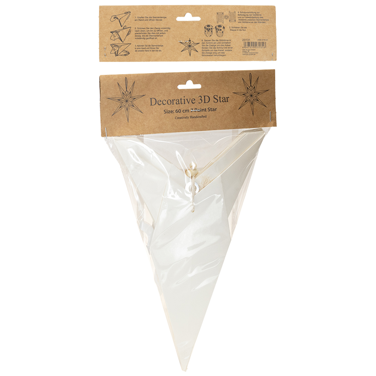 Questa stella di carta non è solo un vero e proprio colpo d'occhio, ma colpisce anche per la sua lavorazione di alta qualità. La carta color crema emana una piacevole semplicità ed è allo stesso tempo elegante. Con un diametro di 60 cm, la stella è ideale per decorare finestre di grandi dimensioni, ma anche intere stanze: come decorazione per il soggiorno sopra il tavolo, come decorazione per finestre con illuminazione d'atmosfera o come elemento decorativo per l'ingresso. Il gancio in cotone integrato con fermacavo facilita l'appendimento e garantisce una tenuta sicura.