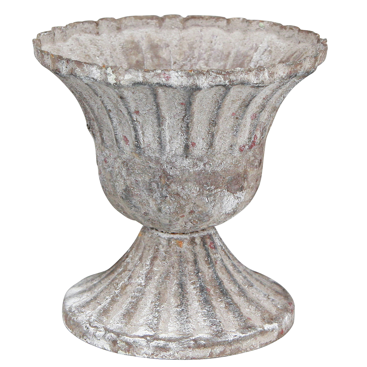 L'antico calice nei colori grigio, ruggine e bianco è realizzato in metallo e ha un diametro di circa 8 centimetri nel bordo superiore; il diametro della base è di circa 7 centimetri. L'altezza totale è di circa 8,5 centimetri e la profondità è di circa 5,5 centimetri.