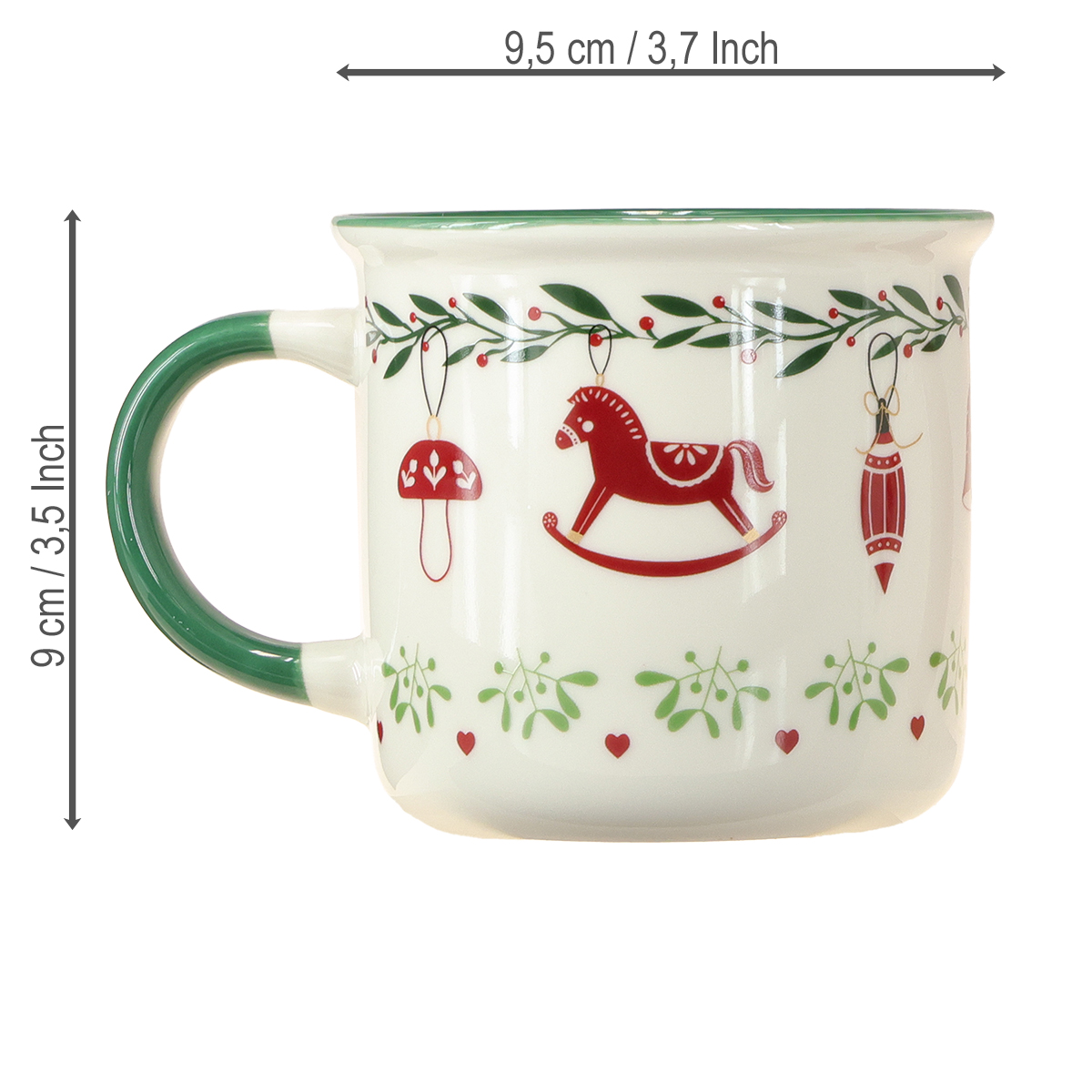 Scopri questo set di tazze natalizie, che non colpisce solo per il suo aspetto, ma anche per le sue caratteristiche pratiche. Realizzate in resistente ceramica, le tazze irradiano colori festosi e portano lo spirito natalizio direttamente nella tua cucina. Il delicato color crema crea un raffinato contrasto con le intense tonalità del rosso e del verde, conferendo alle tazze un'eleganza classica. Le loro comode dimensioni di circa 9 cm le rendono ideali per le tue bevande preferite.