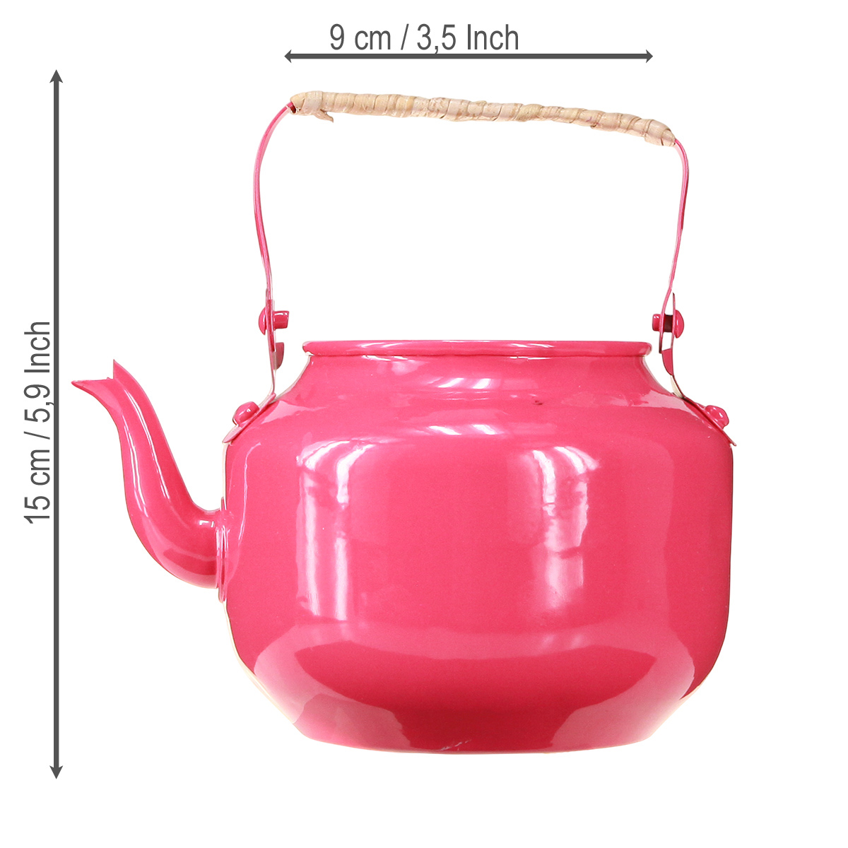 Perché proprio questa teiera? Le sue dimensioni compatte, 15 cm di altezza e 11 cm di diametro, la rendono un oggetto versatile, sia decorativo che pratico. Il colore rosa è fresco e allegro, ma abbastanza classico da non risultare eccessivo. Il robusto metallo garantisce durevolezza e stabilità, mentre il manico rustico con dettagli in bambù si abbina perfettamente allo stile country.
