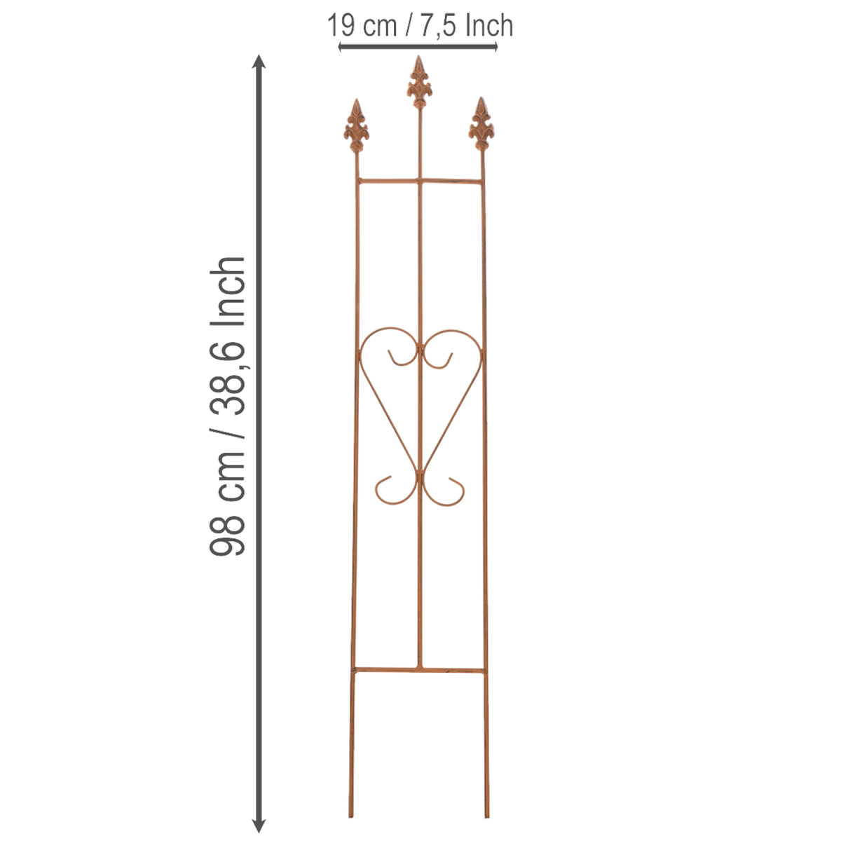 Perché accontentarsi della sola funzionalità quando può essere anche bella? Il nostro traliccio da giardino ha un design decorativo a forma di cuore, che unisce funzionalità ed estetica. Con la sua forma a cuore delicatamente curva, dona romanticismo e giocosità a qualsiasi giardino. Non solo fornisce supporto per piante rampicanti come rose ed edera, ma trasforma anche semplici aiuole o fioriere in una delizia per gli occhi. La finitura in acciaio anticato gli conferisce un fascino rustico e naturale che si integra perfettamente con giardini in stile country o classico. Che venga utilizzato come supporto per romantiche rose o come elemento decorativo sul balcone, questo traliccio offre innumerevoli possibilità.