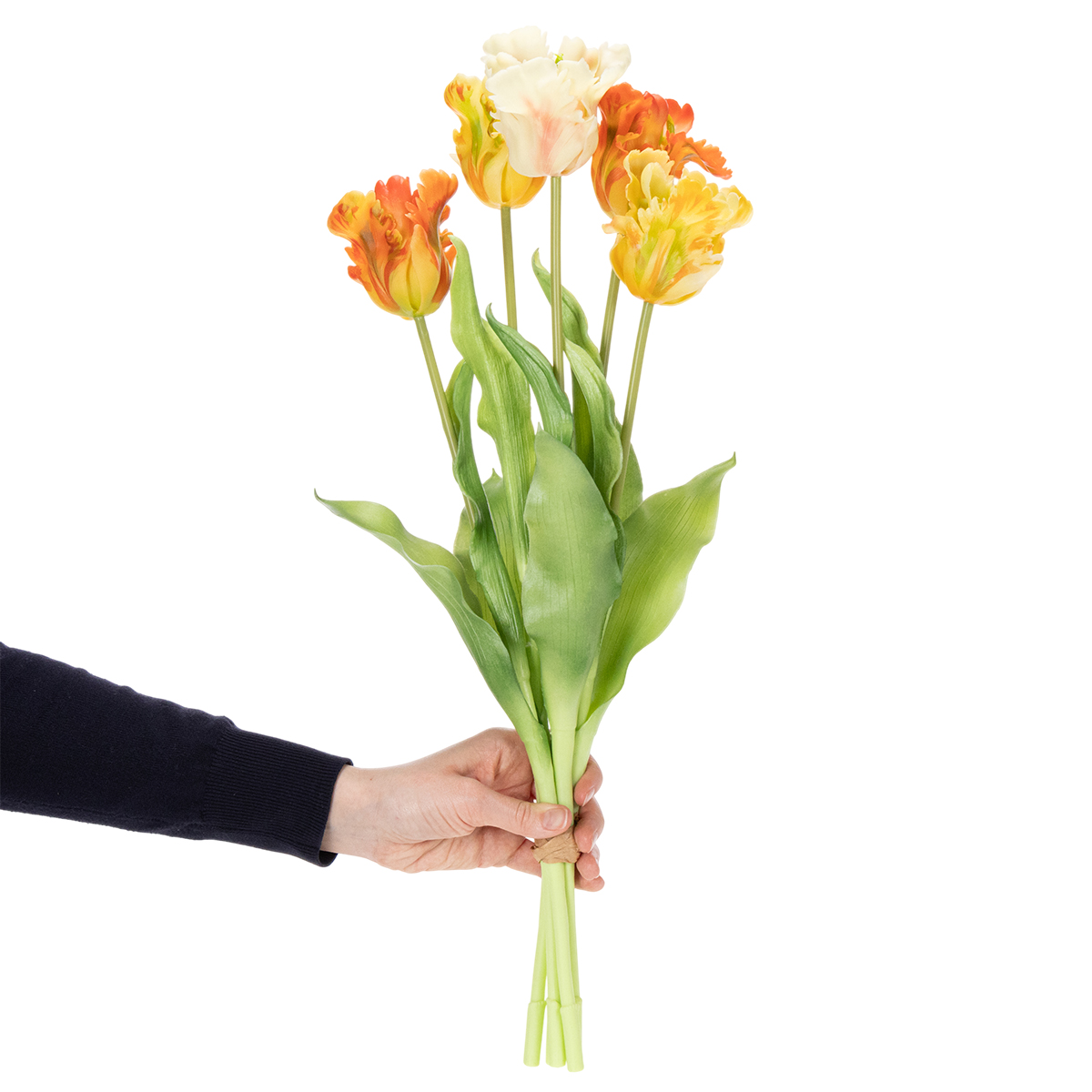 Che ne dite di trasformare il vostro soggiorno in un giardino primaverile in fiore, senza bisogno di alcuna manutenzione? I nostri tulipani artificiali di alta qualità in un vivace arancione sono perfetti per questo! Che si tratti di un suggestivo centrotavola per la colazione con gli amici o di un tocco di stile su una cassettiera, questi tulipani decorativi donano freschezza ed eleganza a qualsiasi stanza. Sembrano così realistici che bisogna guardarli due volte per rendersi conto che non sono veri. E la parte migliore: non appassiscono, non necessitano di annaffiature e non sbiadiscono. Questi fiori artificiali si adattano a innumerevoli stili di interior design, dal moderno al rustico. La loro affascinante combinazione di arancione vivace e foglie delicate dall'aspetto naturale li rende non solo i preferiti in soggiorno, ma anche un'aggiunta versatile per occasioni speciali come matrimoni, feste di compleanno o decorazioni primaverili. Regalatevi un pezzo di primavera che non tramonta mai!