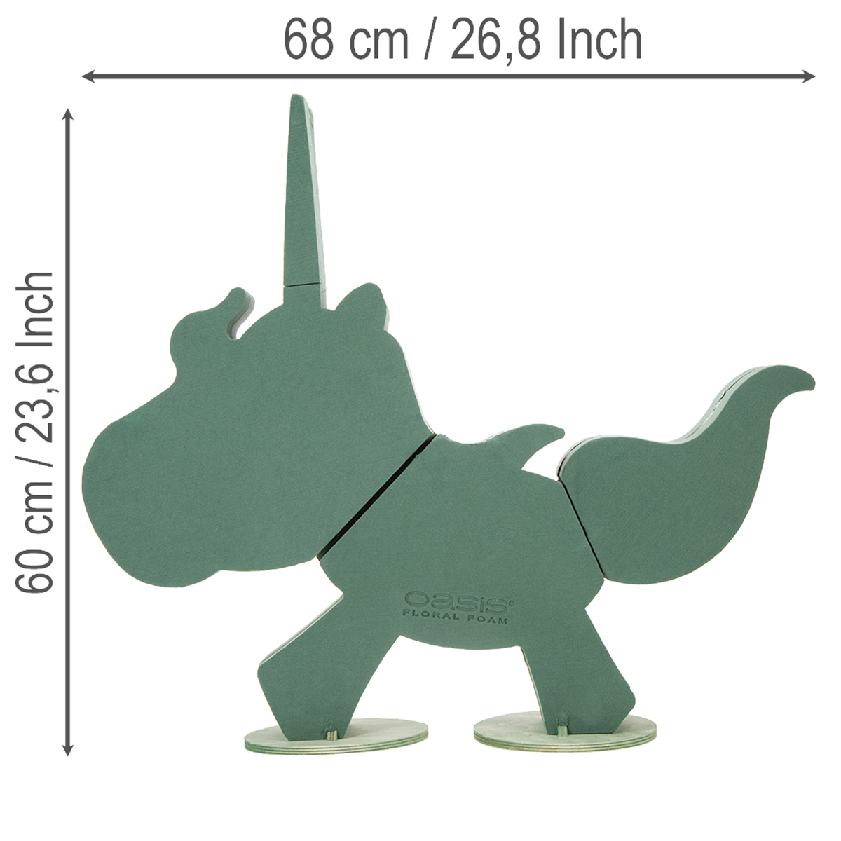 Ottieni l'unicorno alla moda. Crea un'atmosfera incantevole e originale alla tua prossima festa o evento! L'unicorno della serie OASIS® BIOLINE® è costituito principalmente da schiuma verde umida. Si erge su due basi di legno stabili e verdi. La schiuma floreale molto ecologica è dotata di linee di taglio. Questi minimizzano l'essiccazione.