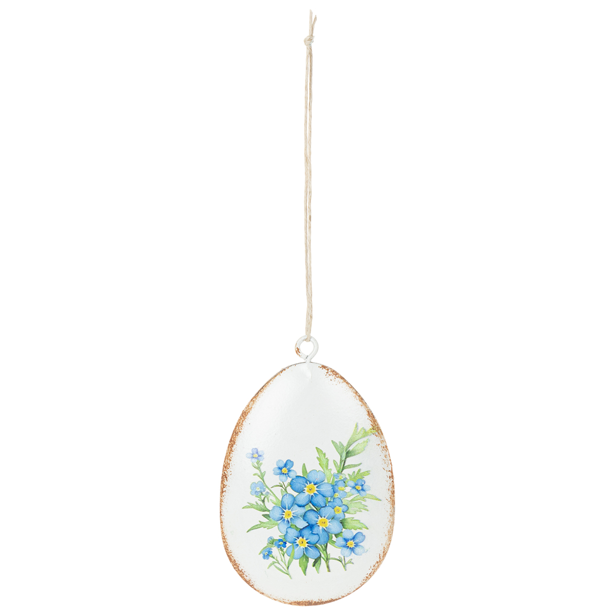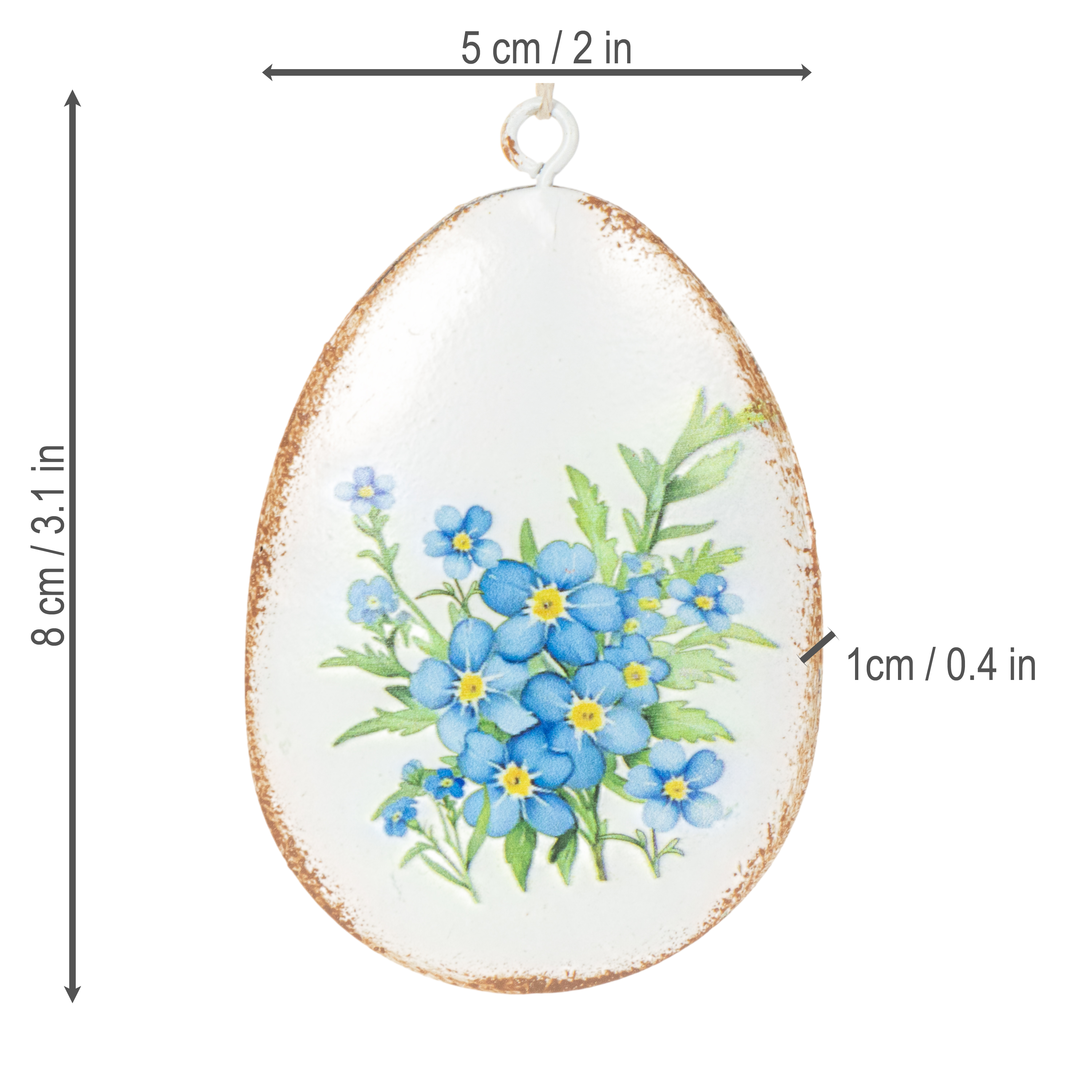 Queste uova di Pasqua decorative in metallo colpiscono per le loro dimensioni e il loro aspetto. Con un'altezza di 8 cm e un diametro di 5 cm, sono perfette per una varietà di usi. La base bianca leggermente opaca è completata da quattro diversi motivi floreali che danno vita alla primavera: dai delicati nontiscordardimé ai vivaci narcisi. Il loro delicato aspetto vintage le rende particolarmente raffinate e si abbinano perfettamente a decorazioni in stile retrò, shabby chic o country.