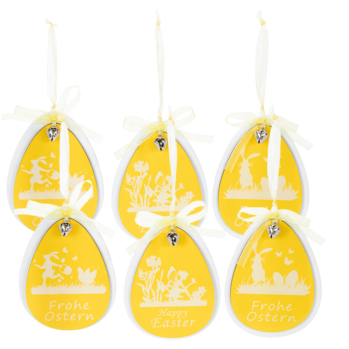 La decorazione in legno è costituita dalla sagoma bianca di un uovo di Pasqua, che è tenuto insieme dal gancio con uno più piccolo in giallo. Un paesaggio primaverile è stampato in bianco sul pendente giallo laccato lucido, in cui un elfo si inginocchia per far riposare una farfalla sulla sua mano. L'augurio "Buona Pasqua" accompagna il nostalgico motivo pasquale. Una piccola campana d'argento e un nastro giallo limone traslucido completano la suggestiva decorazione pasquale del marchio di qualità VIANA.