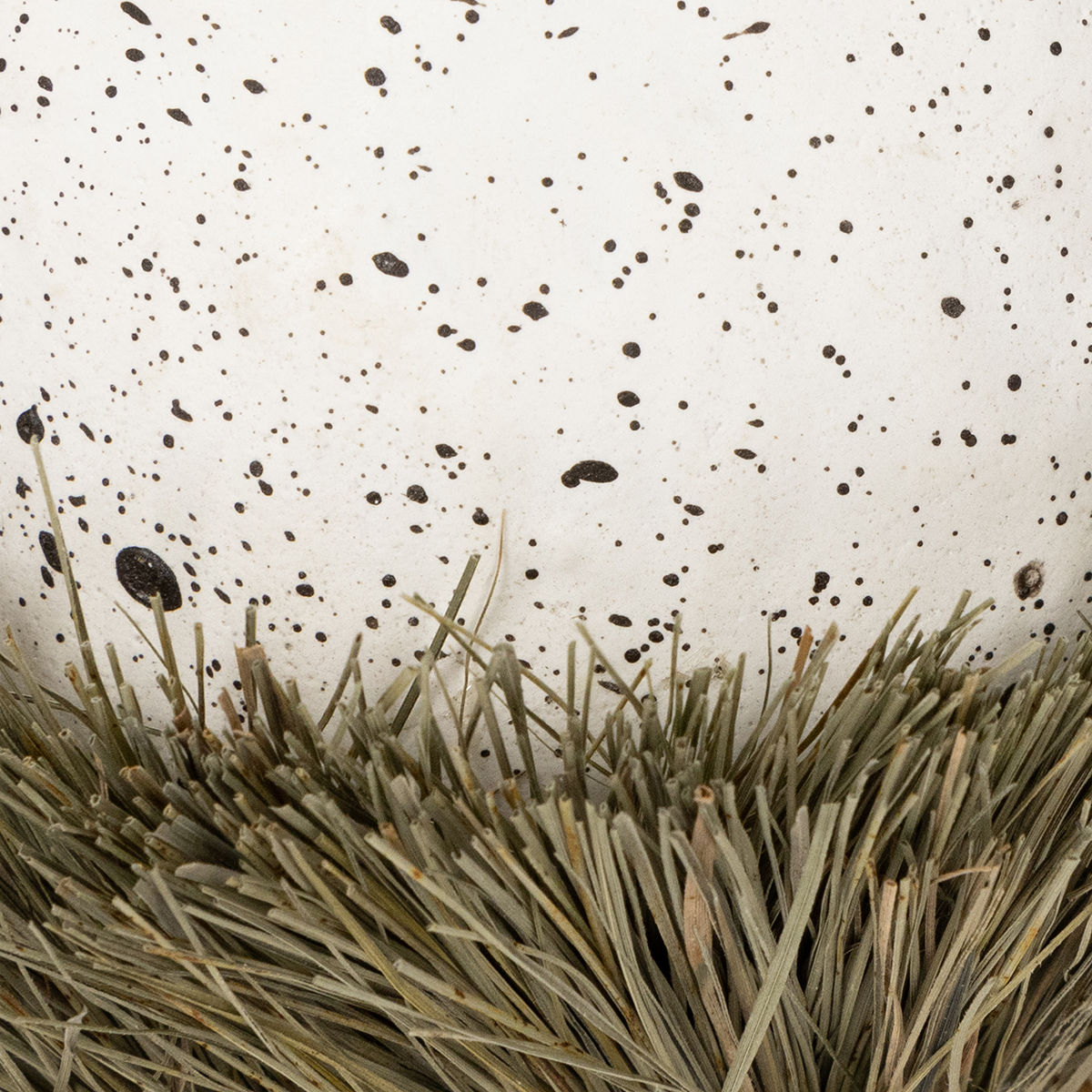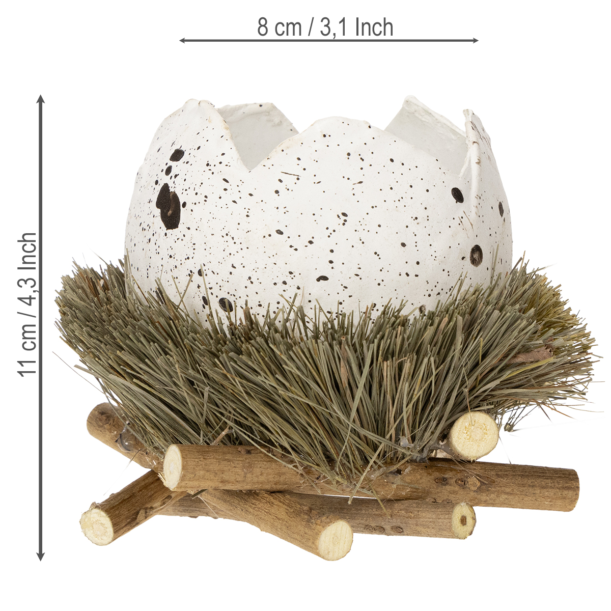 L'uovo bianco decorativo con macchioline marroni è posto in un letto di vera erba secca, che viene posto su una corona di piccoli tronchi. - Quindi il tutto non solo sembra un vero nido di uccelli che potresti trovare in natura, ma è anche sicuro e stabile.