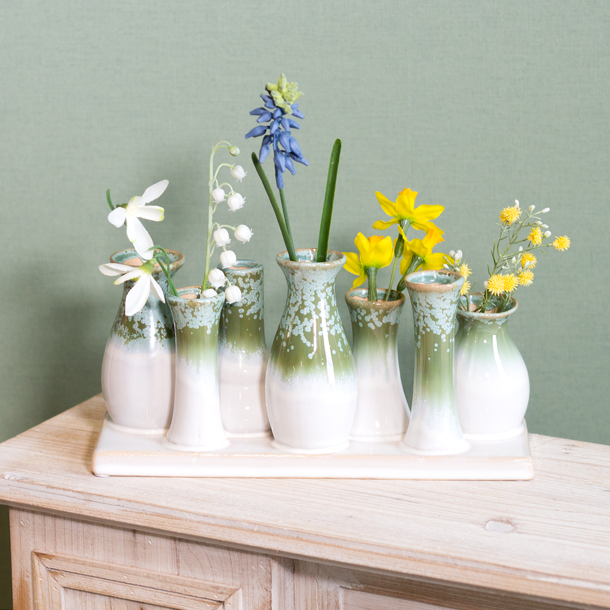 Questo set di sette piccoli vasi decorativi in ceramica su un vassoio coordinato diventerà rapidamente un elemento di spicco del vostro arredamento. Le armoniose tonalità del verde e del bianco evocano la naturalezza del design scandinavo e si abbinano perfettamente a stili minimalisti o rustici. I vasi hanno forme diverse, aggiungendo un tocco visivo al colore crema. Che venga disposto in gruppo o singolarmente, questo set offre innumerevoli possibilità di design.