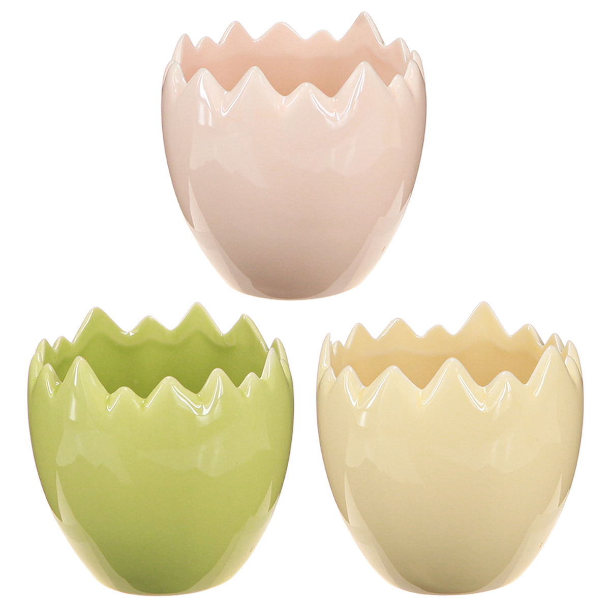 Chi non ama abbellire la propria casa con piccoli e graziosi dettagli? I nostri vasi da fiori a forma di uovo con i loro bordi anticati aggiungono un tocco speciale a qualsiasi stanza! Che siano sul davanzale, sul tavolo o in una composizione decorativa, questi vasi offrono innumerevoli possibilità per mettere in mostra in modo creativo piccole piante, fiori primaverili o persino decorazioni pasquali. Quale davanzale non risplende di un tocco di freschezza primaverile quando questi graziosi contenitori vengono posizionati sopra? La classica combinazione di colori pastello – giallo tenue, rosa e verde fresco – rende questi vasi da fiori un'aggiunta armoniosa a qualsiasi stile di interior design. E la parte migliore: sono disponibili in un pratico set da tre, perfetto per idee decorative personalizzate!