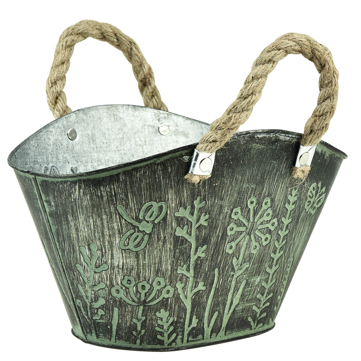 La fioriera ha la forma di una borsa della spesa intrecciata e sembra molto rilassata. All'esterno il vaso in metallo è trattato in verde e grigio scuro e l'aspetto è caratterizzato da un prato stilizzato di fiori selvatici. I manici intrecciati in fibra naturale fanno il resto, rendendo il vaso da fiori ovale un pezzo davvero speciale.