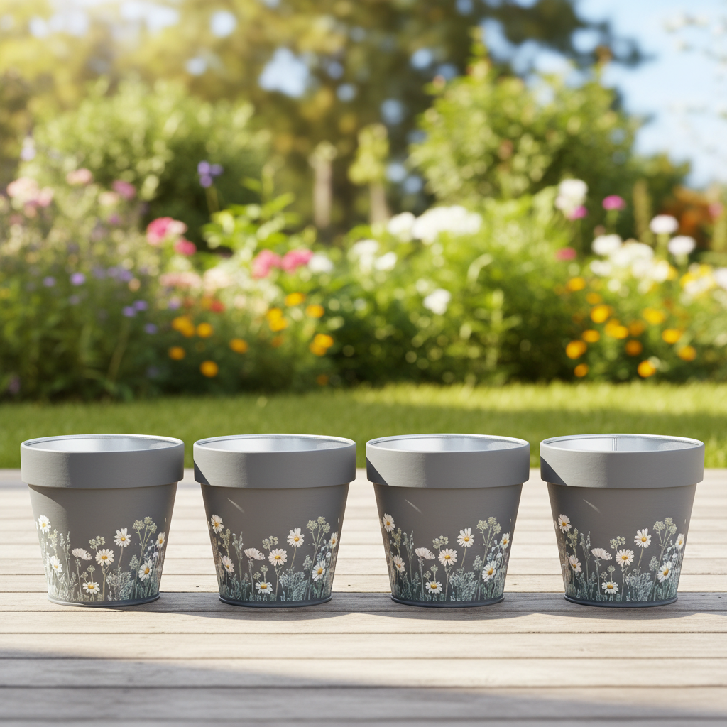 Questo vaso decorativo con motivo a margherita porterà una ventata di aria fresca al vostro arredamento. Che sia sul davanzale della finestra, su una mensola del soggiorno o su una scrivania, il suo design grigio discreto si integra armoniosamente in qualsiasi ambiente. L'affascinante motivo floreale aggiunge un tocco di natura e gioia di vivere a qualsiasi stanza. Quattro vasi in un set: così potrete creare diverse oasi invitanti. Pratico e leggero, realizzato in robusto metallo, questo vaso non è solo bello, ma anche sorprendentemente versatile. Un piccolo gioiello che unisce stile e funzionalità!