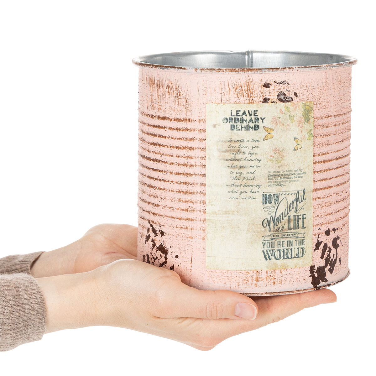 Questo vaso di fiori color salmone da una scatola decorativa rende l'estate colorata! Il contenitore in metallo, accuratamente verniciato con spray ruggine e un colore pastello selezionato, può essere utilizzato come vaso o fioriera. Un adesivo vintage sottolinea l'aspetto raffinato e nostalgico del barattolo di latta. Il fatto che il decoro in metallo sia effettivamente nuovo di zecca lo si vede solo dall'interno color argento. Naturalmente, questa scatola, realizzata appositamente come fioriera, non ha spigoli vivi all'interno.