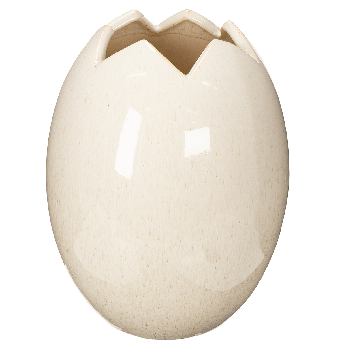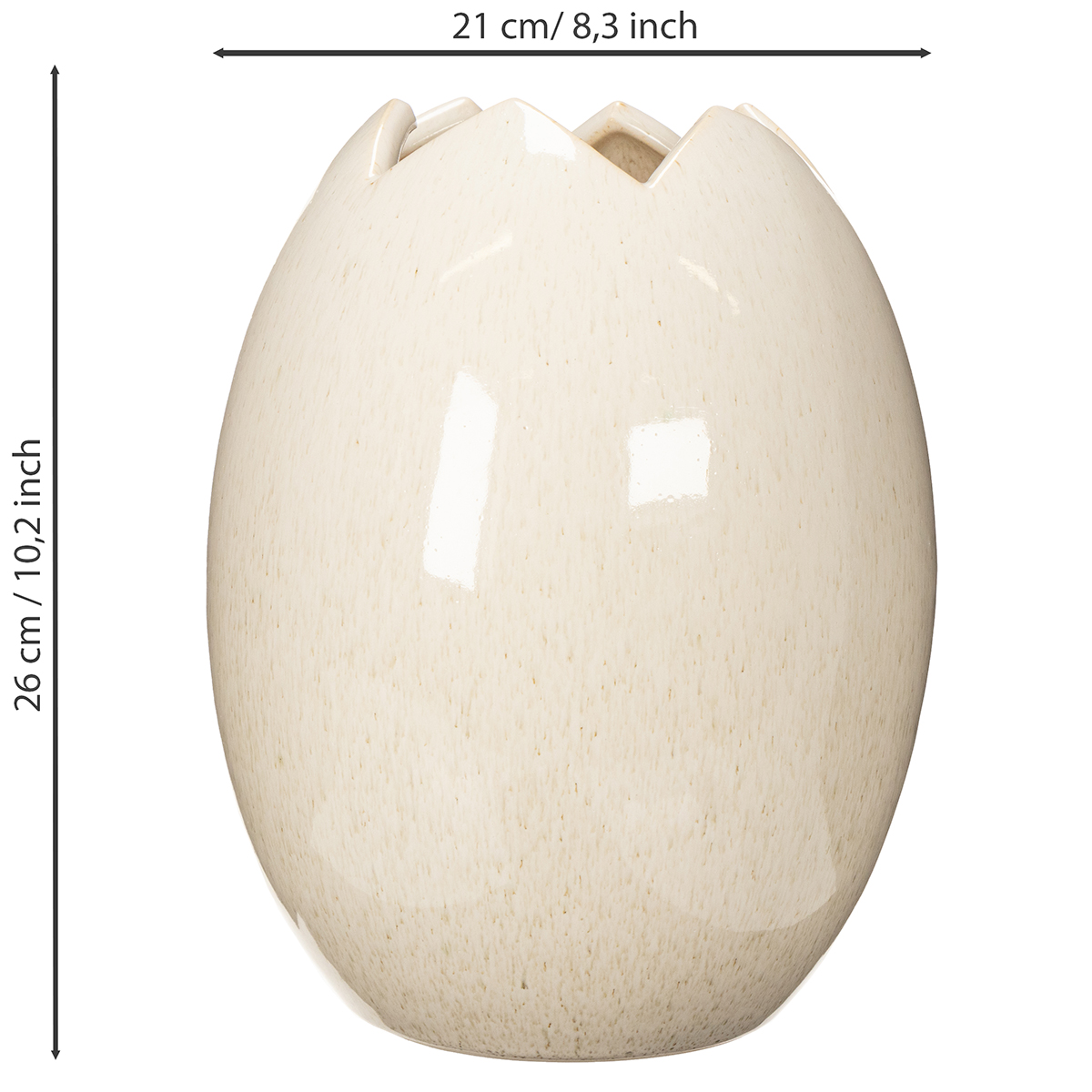 Questo vaso decorativo a forma di uovo coniuga un design moderno con una funzionalità versatile. Grazie alle sue dimensioni (26 cm di altezza, 21 cm di diametro) e al materiale ceramico di alta qualità, si integra perfettamente in diversi spazi abitativi. La sua elegante finitura bianco maculato emana un'eleganza sobria e mai invadente. L'effetto "guscio d'uovo" screpolato sul bordo superiore lo rende un vero e proprio colpo d'occhio.