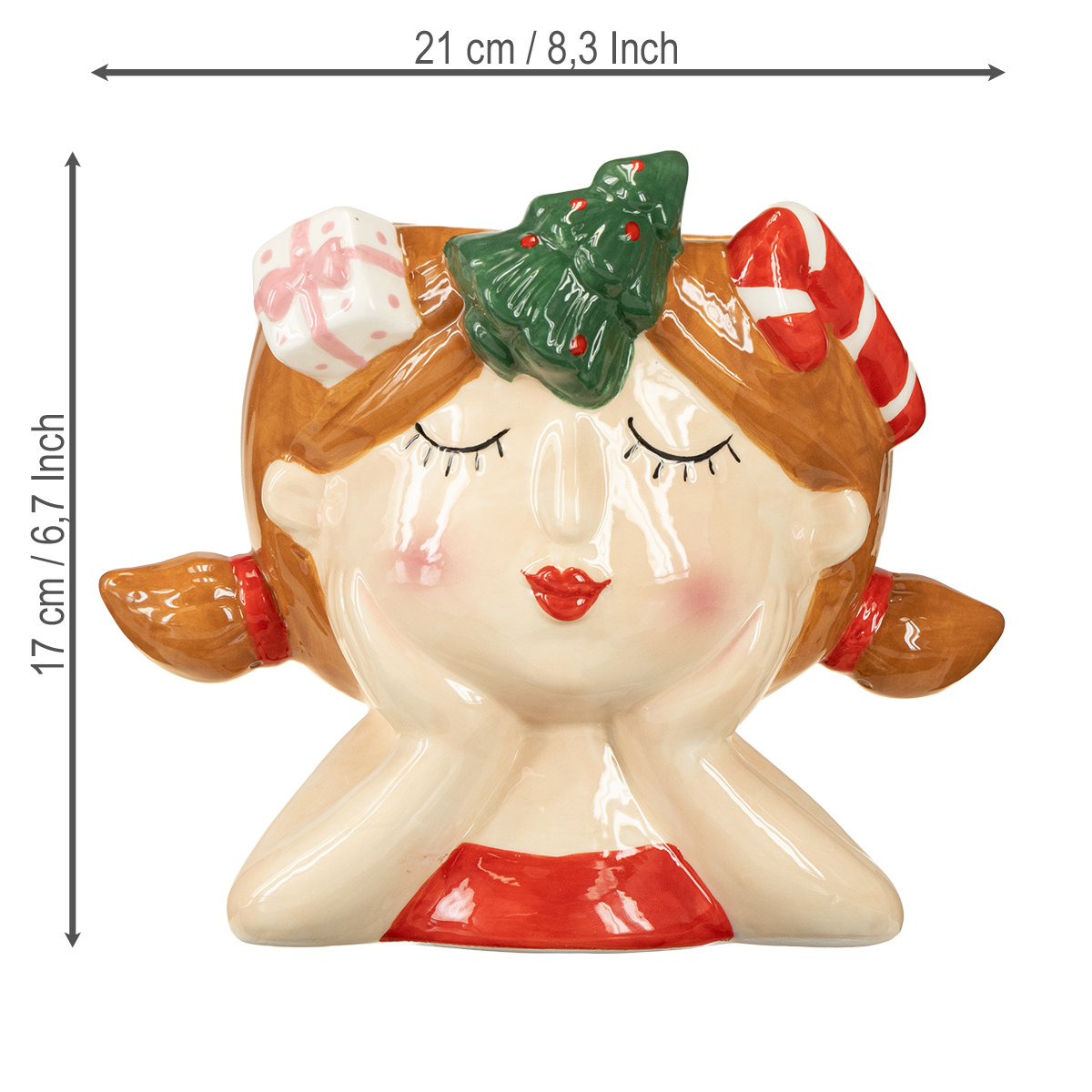 Il Natale è alle porte e cercate qualcosa per rendere le vostre decorazioni natalizie davvero uniche? Allora questa incantevole fioriera in ceramica vi strapperà subito un sorriso! Con il suo grazioso design a forma di una ragazza sognante con decorazioni natalizie tra i capelli, questa fioriera non solo porta un allegro spirito natalizio nella vostra casa, ma mette anche in risalto magnificamente qualsiasi pianta o le vostre decorazioni dell'Avvento. Particolarmente suggestivi sono i dettagli amorevoli del busto, come i nastri rossi, il suo sguardo sognante e i piccoli elementi natalizi come un mini albero di Natale e un bastoncino di zucchero tra i capelli. Questo rende la fioriera perfetta per chiunque voglia aggiungere un tocco di umorismo alle proprie decorazioni!