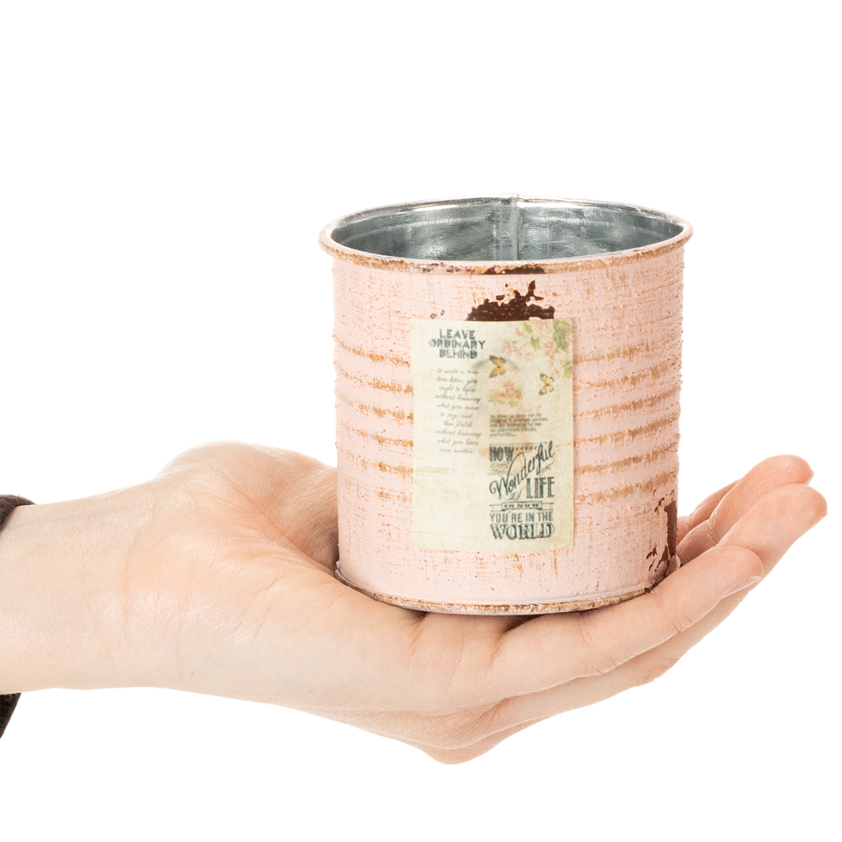 Su superfici delicate, si consiglia di appoggiare la latta retrò su un sottobicchiere. Se utilizzato come mini fioriera, si consiglia anche un rivestimento in alluminio e uno strato di drenaggio per prevenire la ruggine e il marciume radicale.