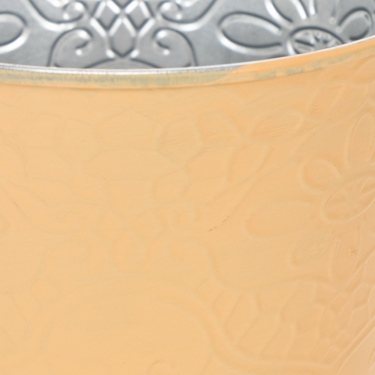 Il motivo retrò ornato con fiori risulta meravigliosamente tridimensionale grazie alla goffratura sul vaso di metallo. Questo effetto è ulteriormente accentuato dall'applicazione leggermente irregolare della vernice sul vaso di fiori: sulla decorazione metallica si possono vedere singole pennellate di colore pastello.