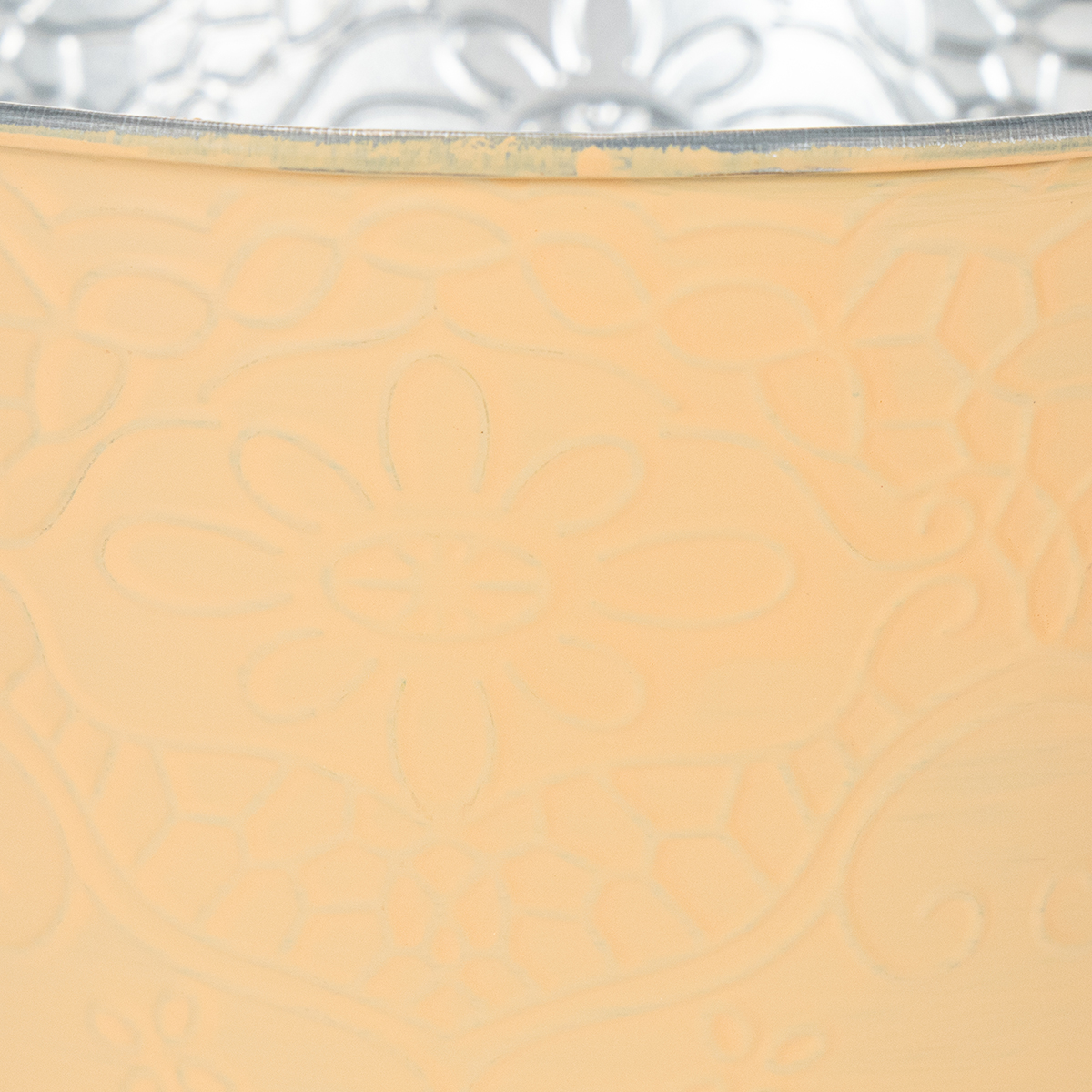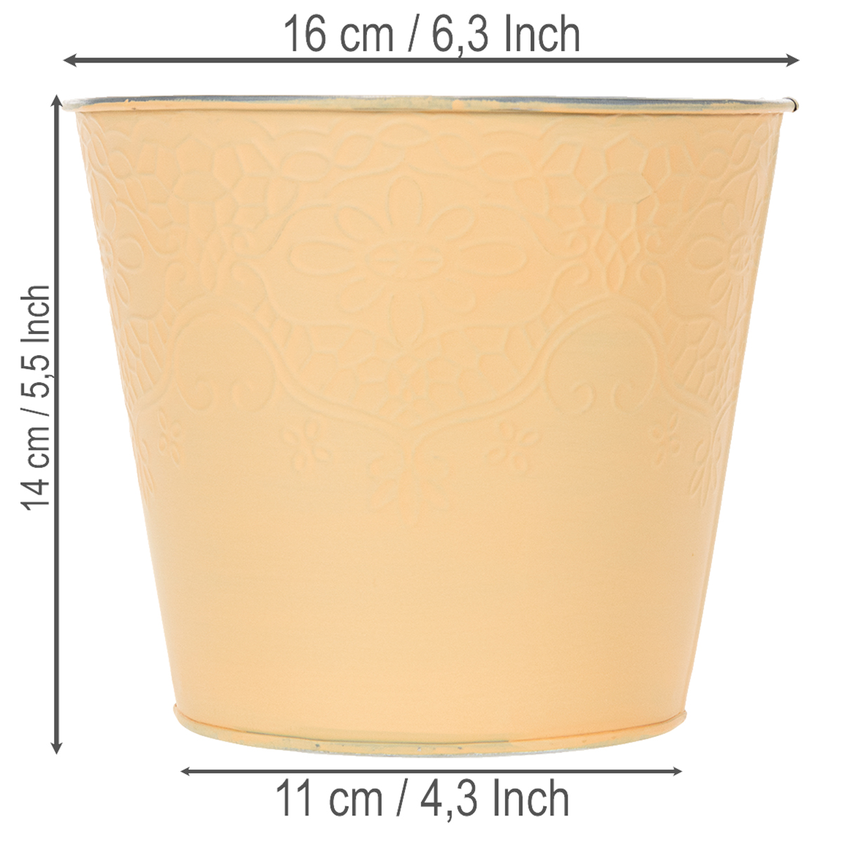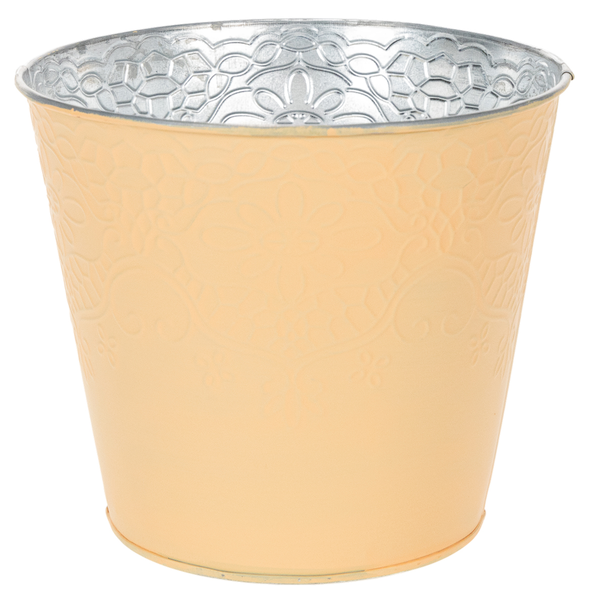 Il motivo è in rilievo nei dettagli con viticci e motivi floreali e si presenta sul vaso da fiori. L'esterno dipinto di arancione contrasta con l'interno argento metallizzato non trattato con la base zincata.