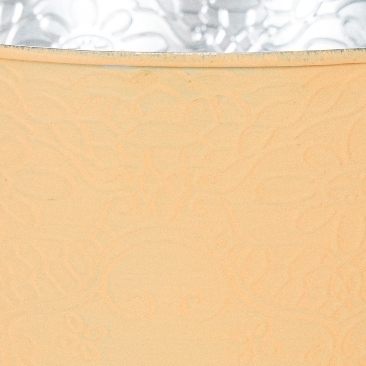 I fiori e i viticci in rilievo conferiscono al vaso un fantastico aspetto vintage. L'esterno piace con il colore pastello alla moda arancione applicato con pennellate visibili.