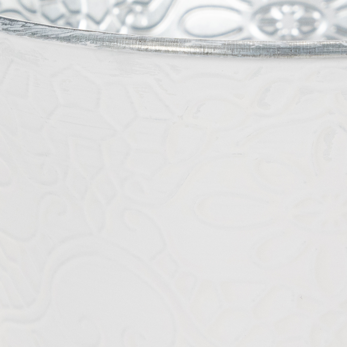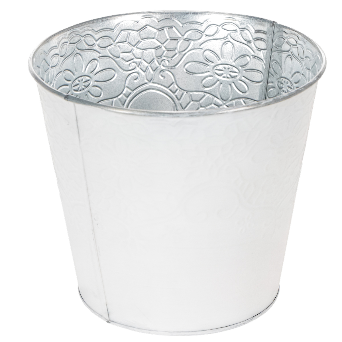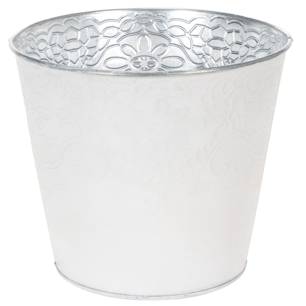 Un motivo dettagliato di viticci e fiori adorna la fioriera in metallo come una goffratura. In combinazione con il dipinto bianco pastello all'esterno, questo crea un cachepot meravigliosamente nostalgico per la primavera!