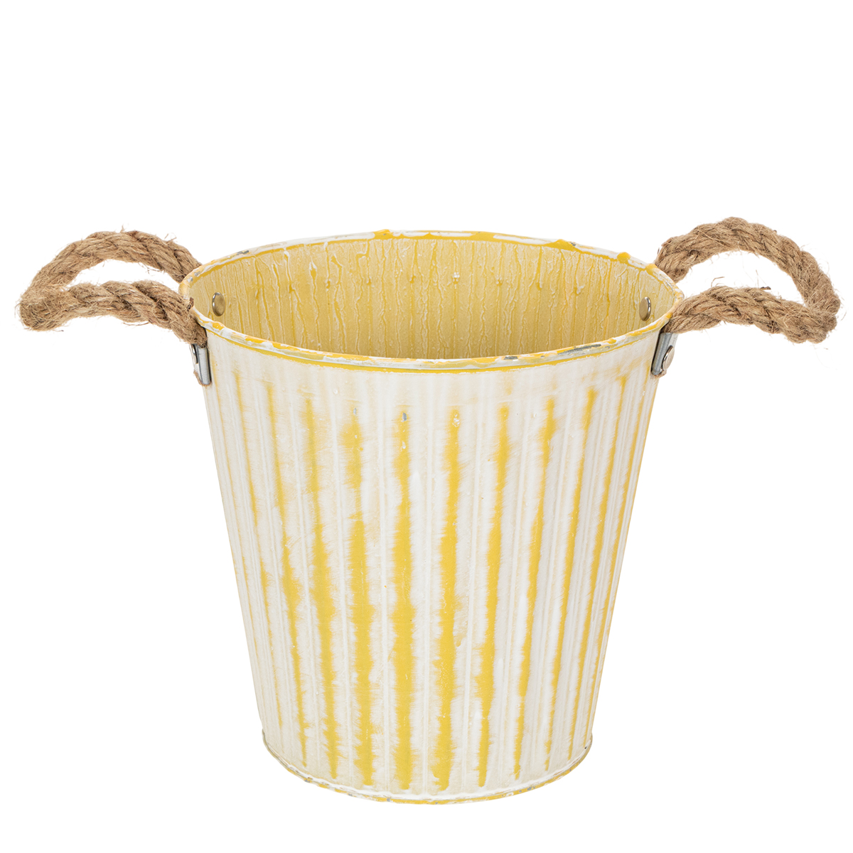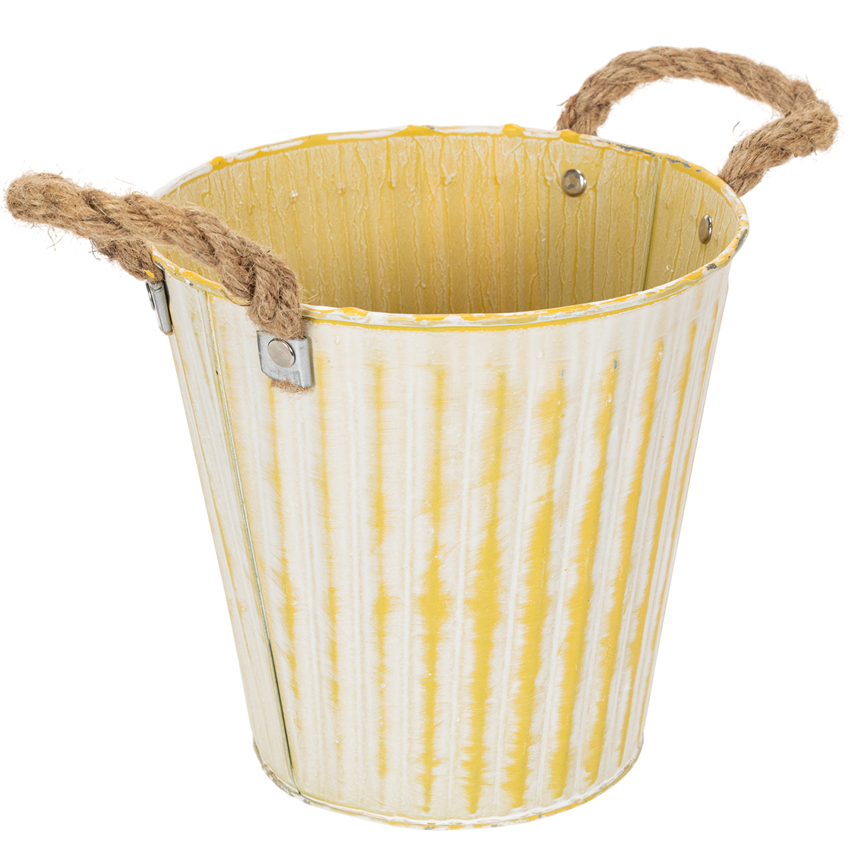 Questo vaso in metallo è perfetto per le decorazioni primaverili: in giallo pastello, la fioriera con manici in cordoncino di juta si presenta in bianco slavato in uno shabby chic alla moda.