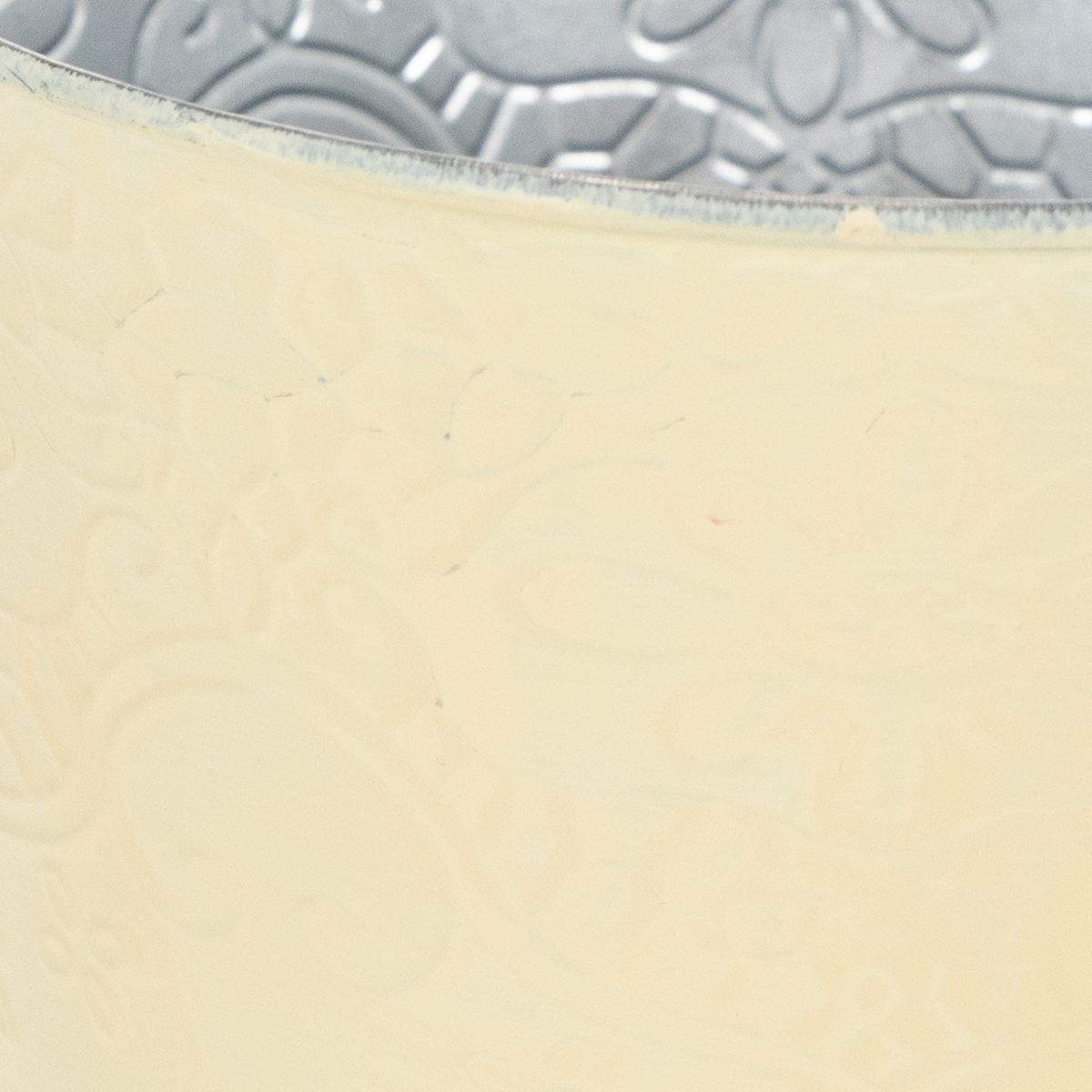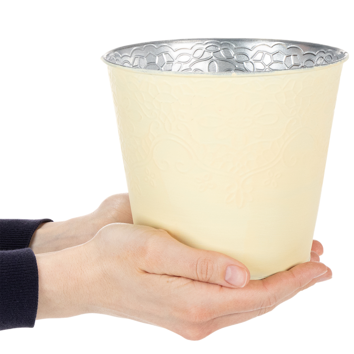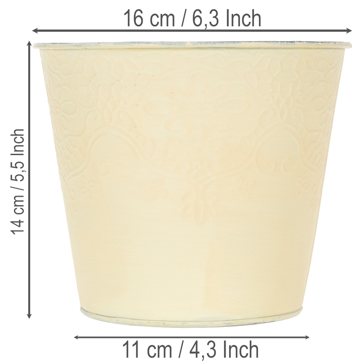 La decorazione in metallo di alta qualità è decorata con un motivo floreale in rilievo pieno di retrò chic e dipinto all'esterno in giallo brillante con pennellate visibili. Ricordano fiori e viticci sul vaso di fiori