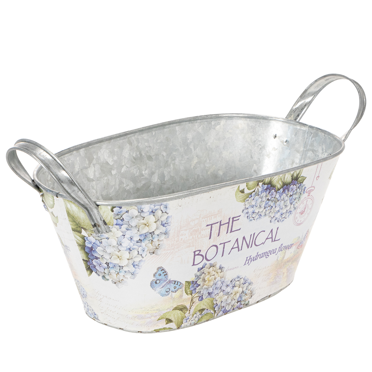 La fioriera in metallo con manici con la sua stampa dettagliata di ortensie blu ti trasporta in un giardino fiorito da sogno.