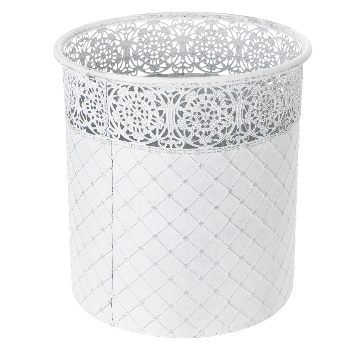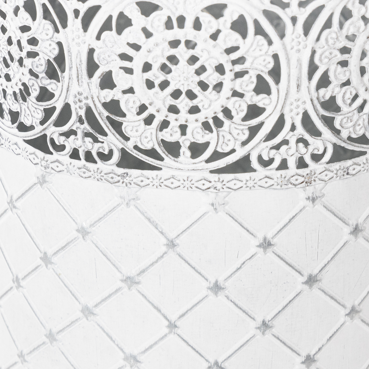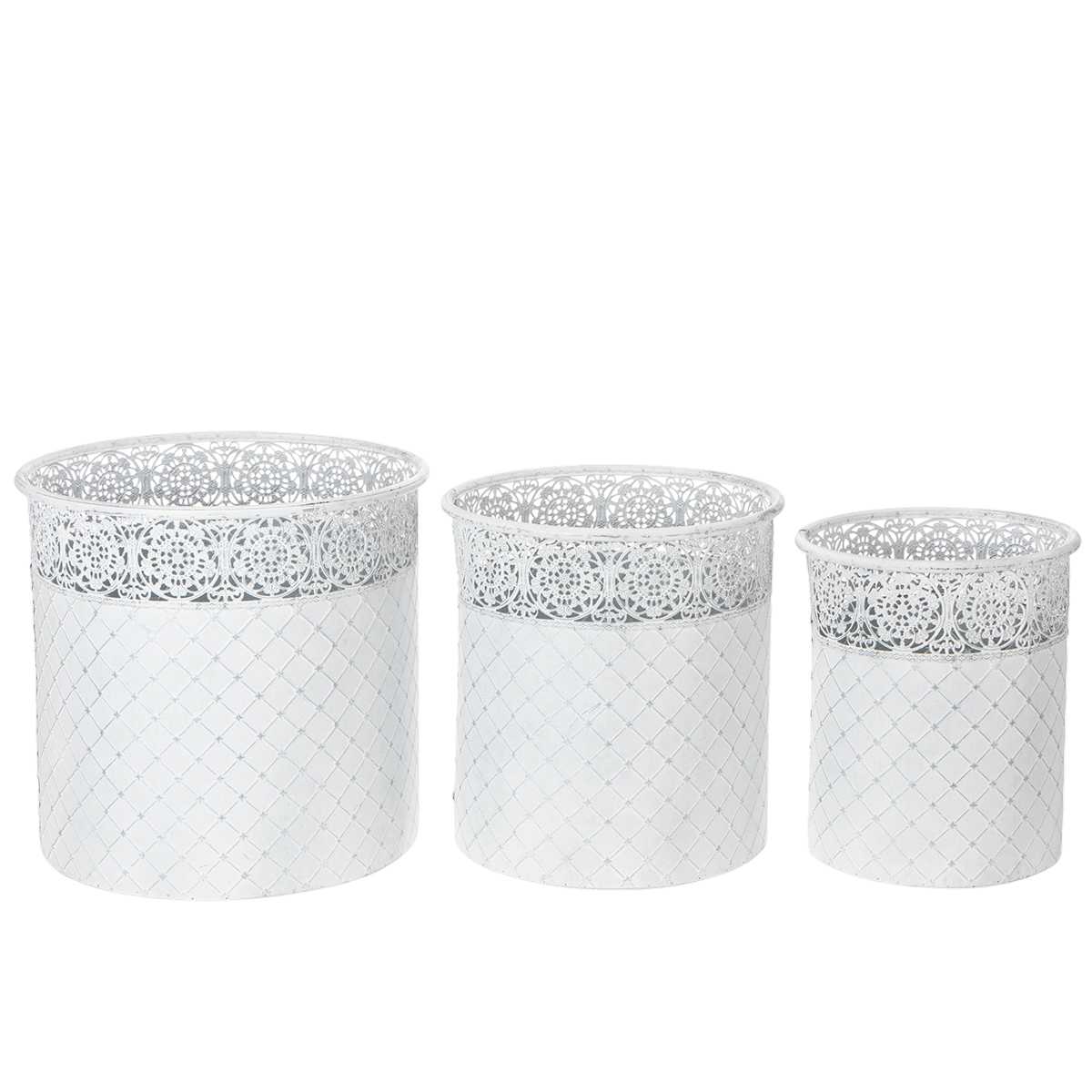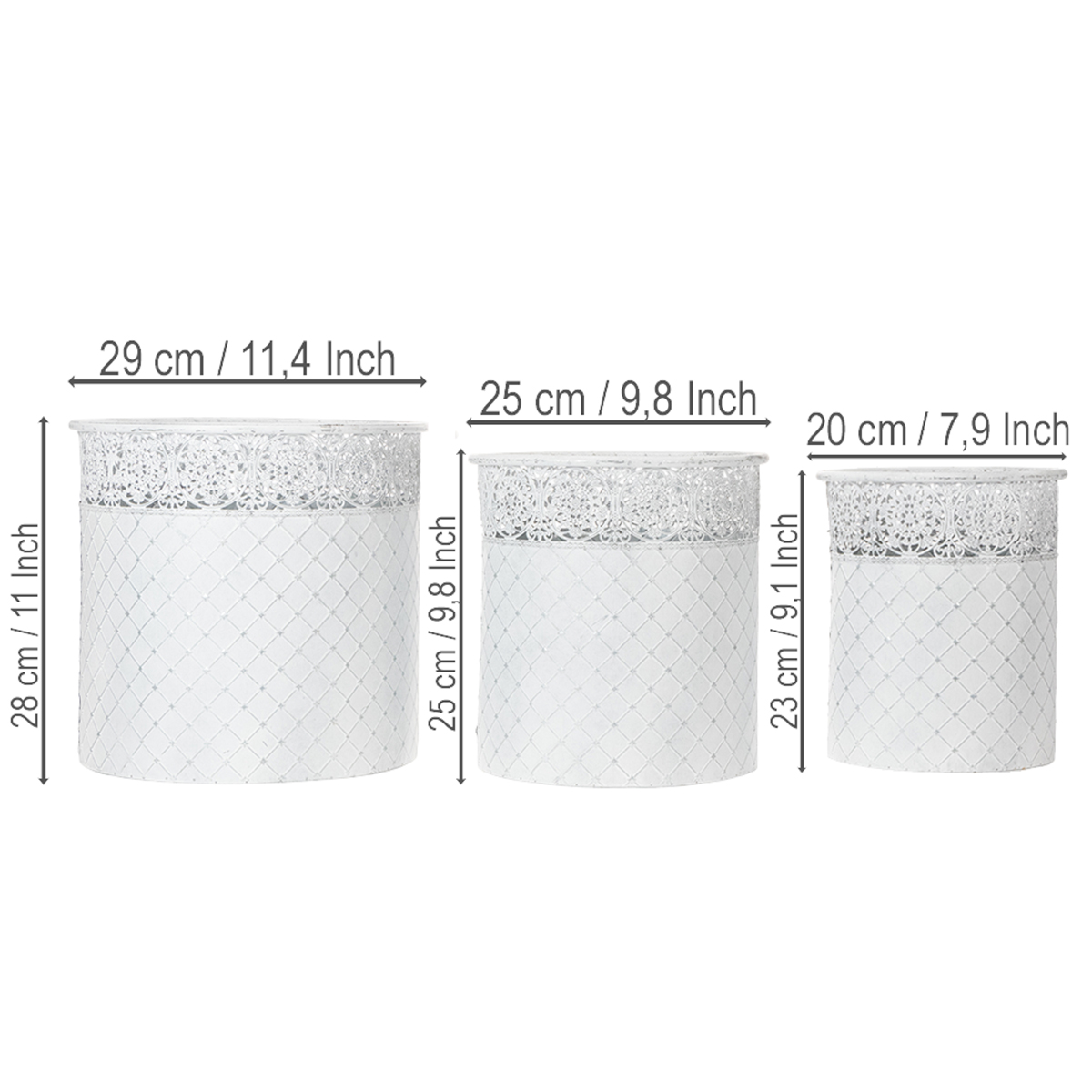 Vaso per piante con motivo a pizzo, contenitore in metallo, secchiello decorativo, bianco, argento, shabby chic, H28/25.5/23.5cm, Ø29.5/25.5/20cm, set da 3