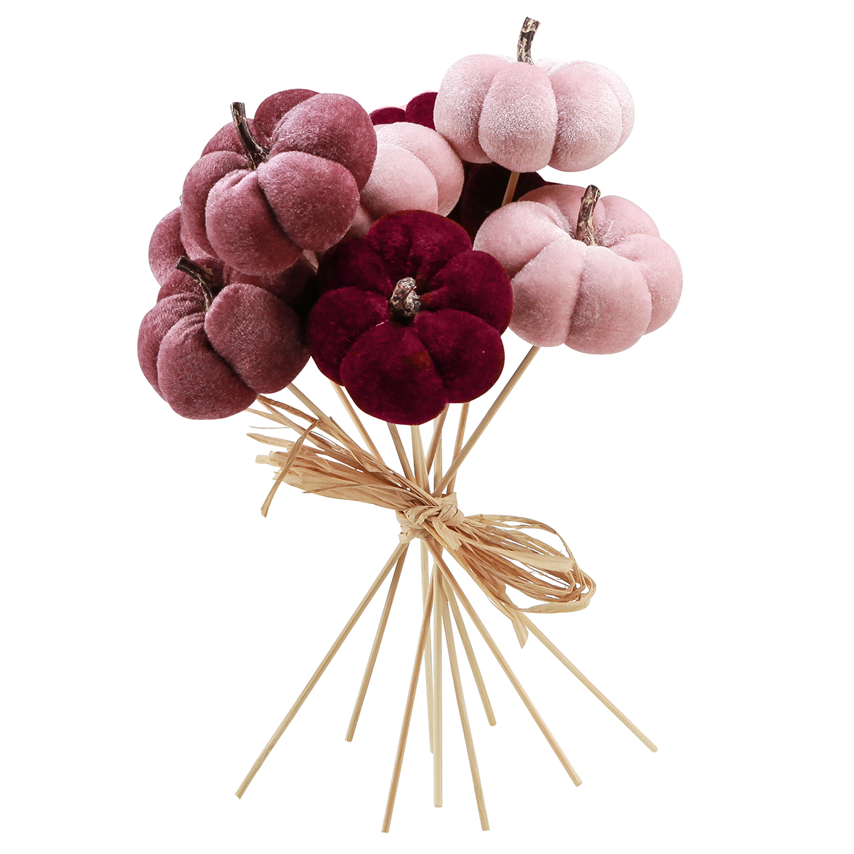 Un tocco glamour e allo stesso tempo un'atmosfera calda e invitante: queste zucche combinano toni bordeaux/bacche e rosa per creare una meravigliosa composizione che ricorda la ricca stagione del raccolto. Sia che tu le scelga come parte della decorazione del tuo buffet festivo, le integri in composizioni floreali stagionali o le usi come accento per progetti fai-da-te, queste zucche decorative su un bastone offrono una varietà di opzioni di design.